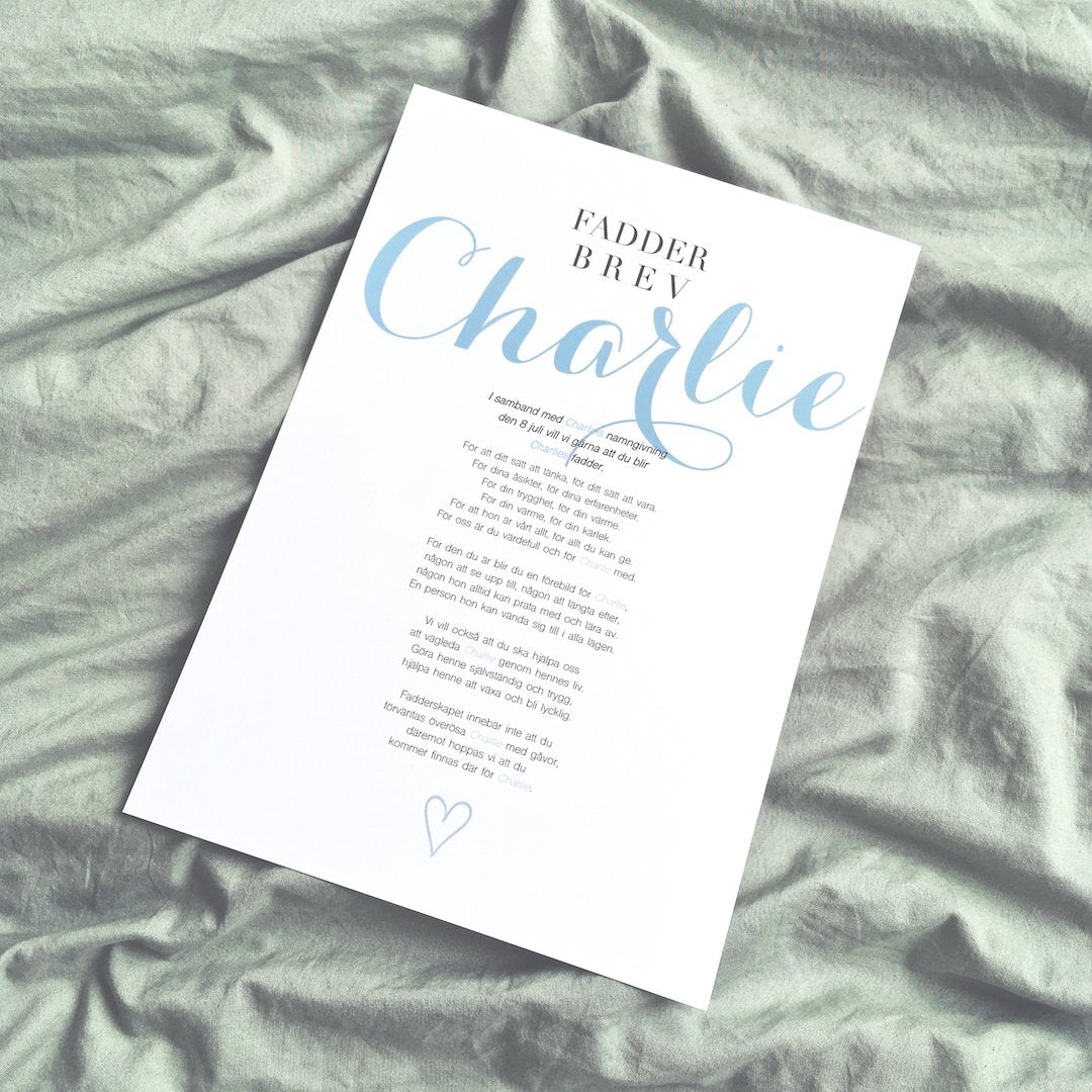 - Färg på det stora namnet, vanligtvis fadderns (rosa, blå eller den nyans du önskar). Guldfärgade bokstäver ingår i Fadderbrev Deluxe, Fadderbrev med Foto, Fadderbrev Chic och Fadderbrev Chic med foto.)